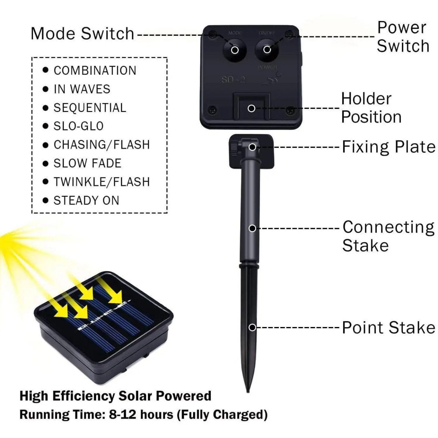 Drivs av solenergi med 8 belysningslägen för stadiga eller blinkande effekter.